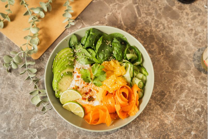 Reis | Mango | Möhre | Babyspinat | Gurke | Avocado | Edamame | Röstzwiebeln | Sesam | Limettendressing